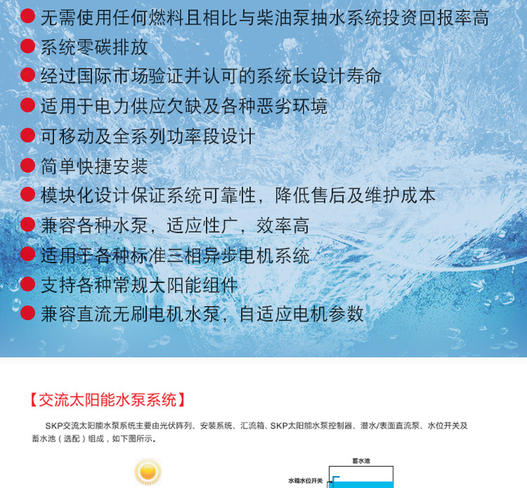 易用性好:只需將太陽能板接入變頻器,通電后即可實現(xiàn)交流水泵自動啟動