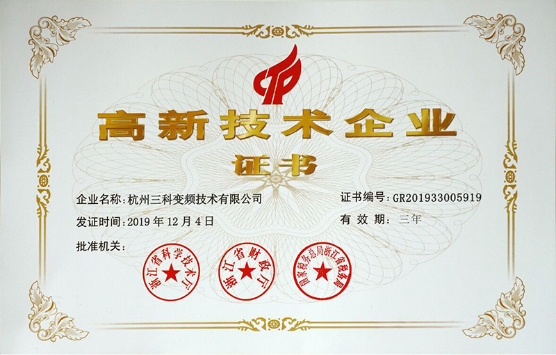 杭州三科變頻器技術(shù)有限公司高新技術(shù)企業(yè)認(rèn)證