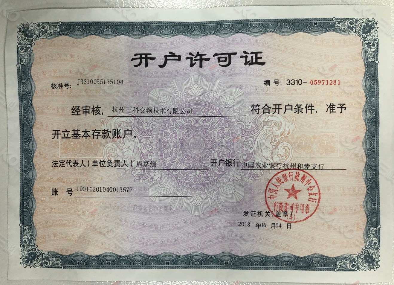 杭州三科變頻技術(shù)有限公司開戶許可證