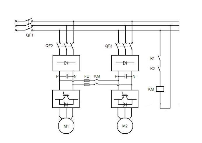 交流接觸器KM和熔斷器FU是VFD的直流母線并聯(lián)時(shí)的保護(hù)裝置,交流接觸器的閉合必須同時(shí)滿足兩臺(tái)VFD的直流母線充電電壓達(dá)額定電壓,否則交流接觸器KM就不吸合。當(dāng)兩臺(tái)VFD其中一臺(tái)出現(xiàn)故障,直流母線電壓發(fā)生急劇變化或其中一臺(tái)VFD出現(xiàn)故障時(shí),交流接觸器KM斷開(kāi)。在特殊情況下交流接觸器KM可以用空氣斷路器替代,改用人工操作,在每次VFD上電前,必須認(rèn)真檢查空氣斷路器的開(kāi)合狀態(tài),確保斷路器已經(jīng)打開(kāi)方可送電,避免因充電電流過(guò)大,損壞充電電阻或整流橋。