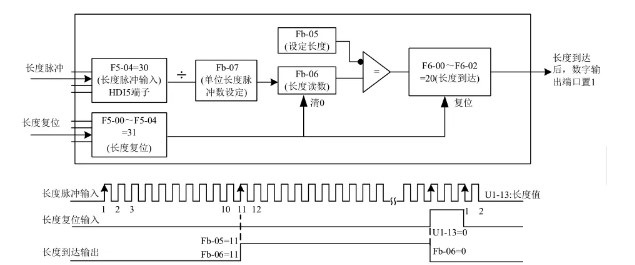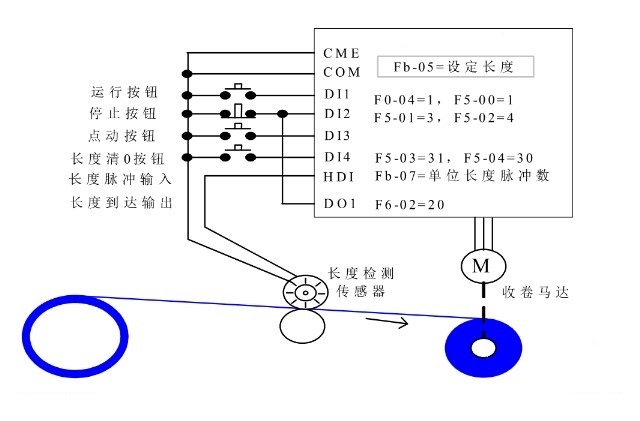 當(dāng)通過DI(DI功能選30)端采集長度脈沖,其中終端采樣的脈沖數(shù)除以每米的脈沖數(shù)Fb-07,可以計算出實際長度Fb-06。而當(dāng)實際長度大于設(shè)定長度Fb-05時,多功能數(shù)字開關(guān)輸出“已達(dá)到長度”O(jiān)N信號。在定長控制過程中,可以通過多功能DI端子(DI功能選擇為31)重新設(shè)定長度。具體設(shè)置如下圖所示。